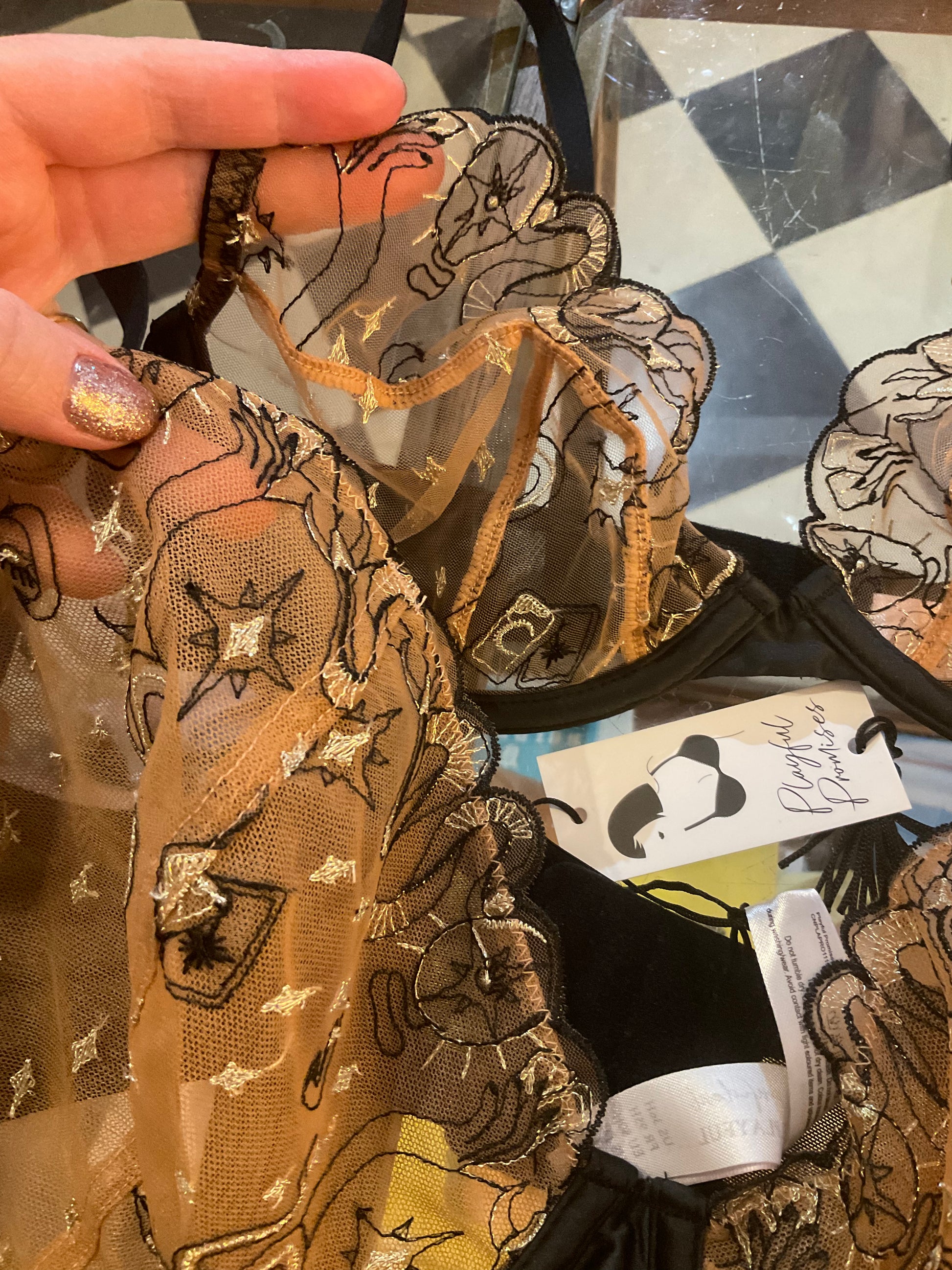 Dive into the world of astrology and refresh your lingerie drawer with the Anna Mystical Embroidery Plunge Bra. The sheer peachy almond mesh cups are embroidered with mystical gold and black snakes, fortune teller cards, moons and stars. The cups are underwired with black satin, finished with black adjustable bra straps with gold studded details.