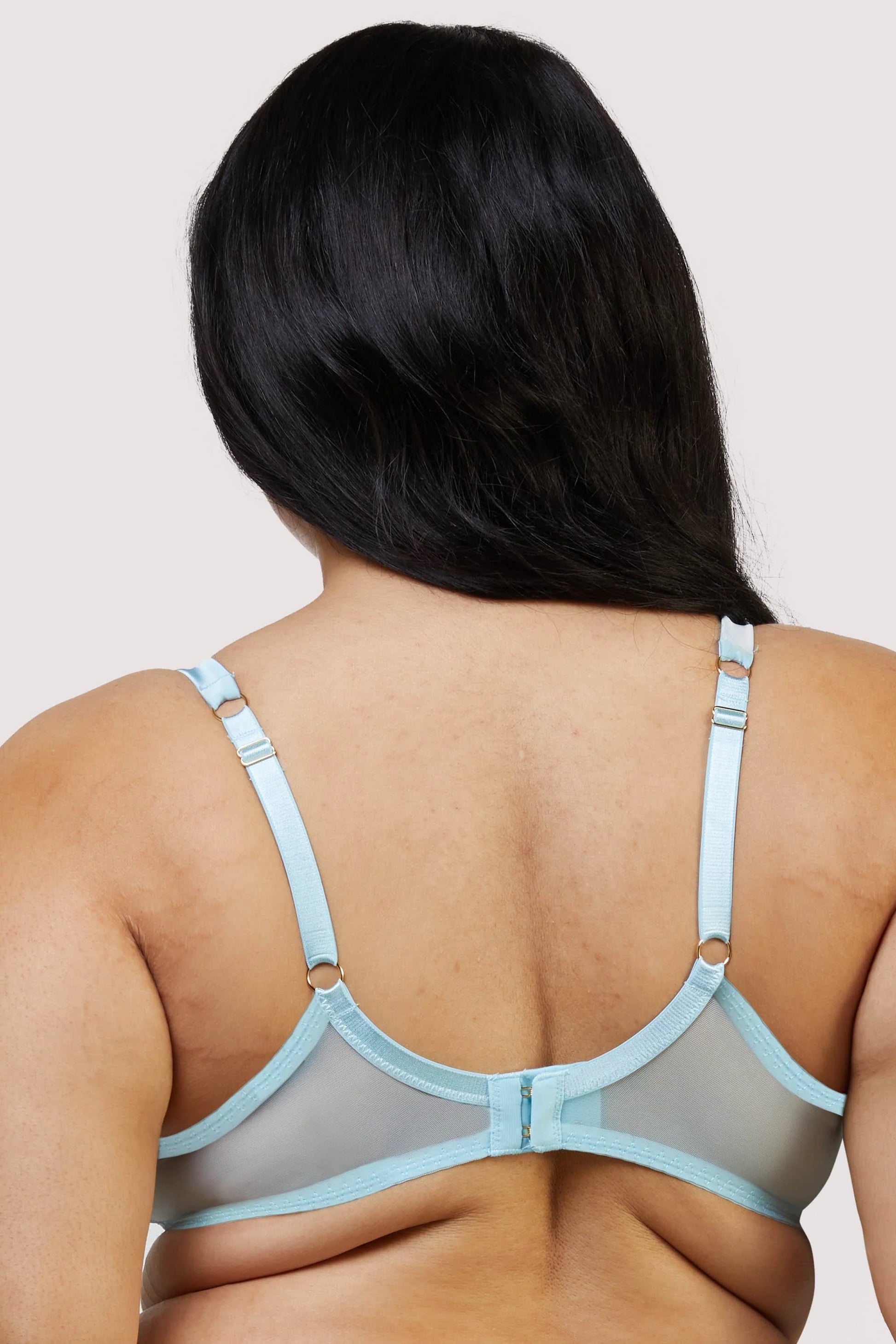 The Ayaka Blue Wave Embroidery Balconette Bra features soft baby blue mesh cups with a delicate shimmery gold embroidery overlay. The gold embroidery design represents waves with a little gold seashell charm in the centre for the full oceanic look.