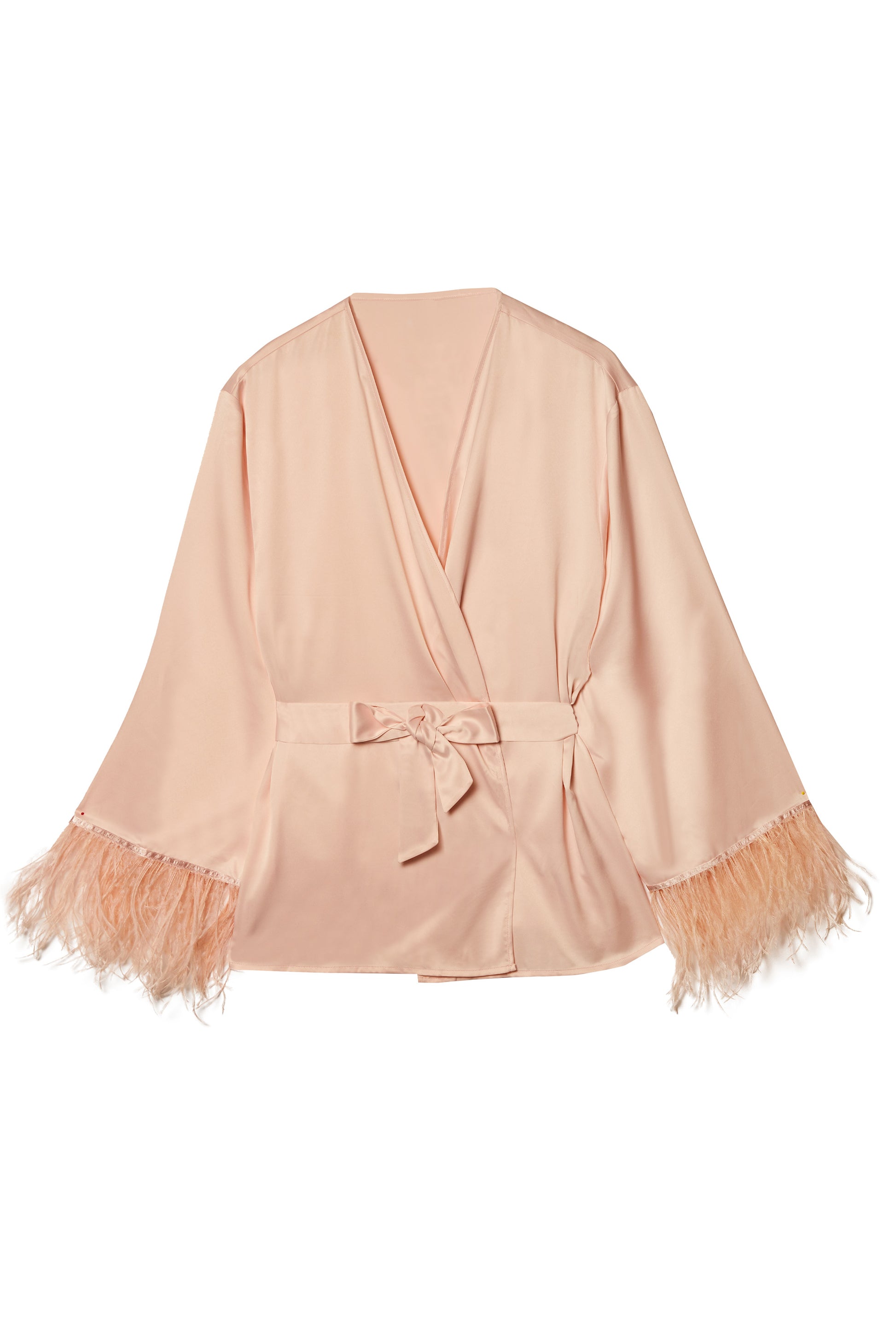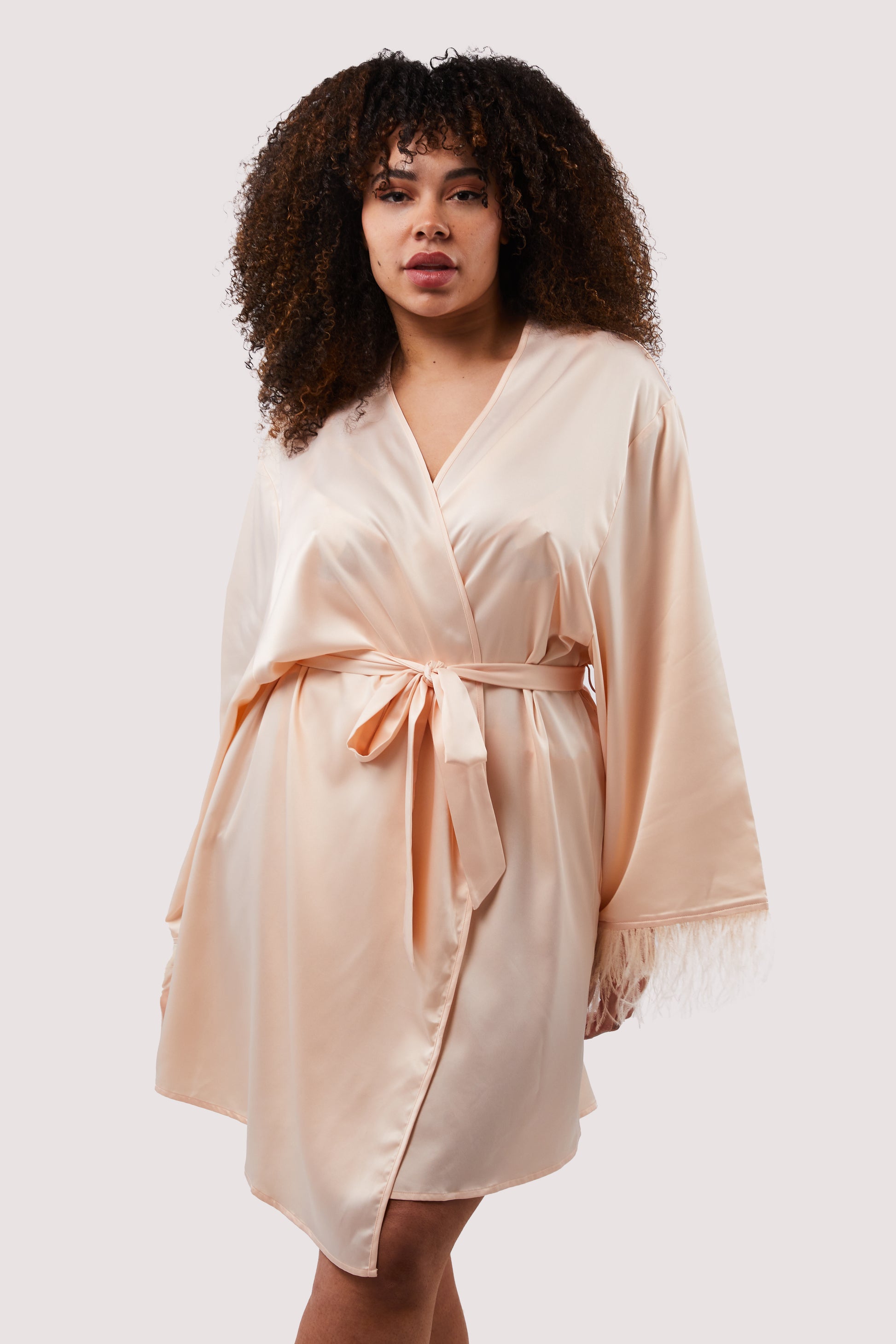 Super soft slinky satin in the most powdery blush pink trimmed with luxurious feathers. The ultra-smooth satin glides over your skin like silk, making it ideal for wearing alone or over a beautiful lingerie set or slinky dress!