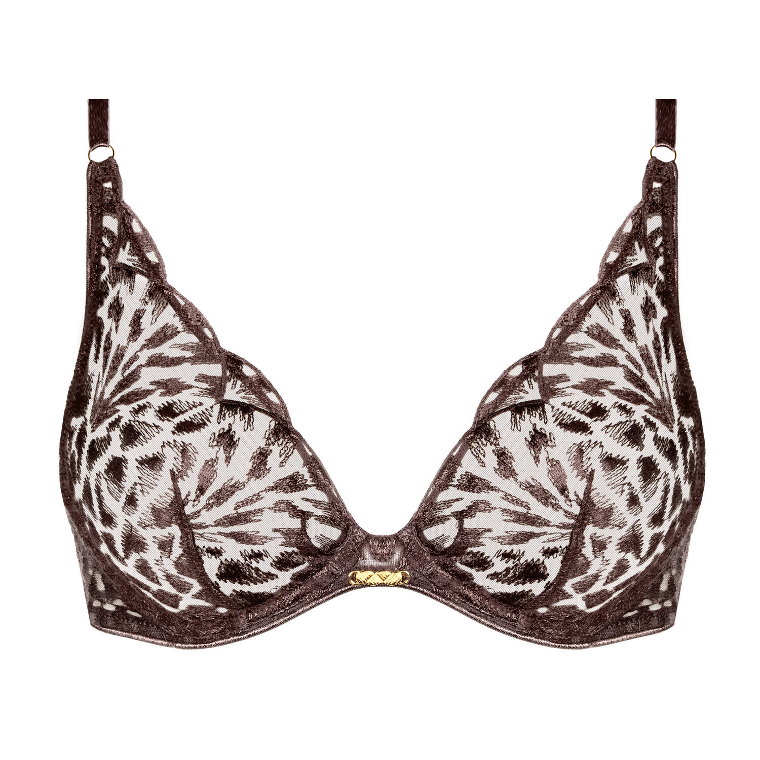 Combining comfort with seduction, the Crazy in Love underwired triangle bra features see-through embroidered fabric that extends high up the neckline for a very sexy plunging cleavage. Between the cups and on the shoulders, gold details echo the shimmer of the fabric for a thoroughly captivating look.