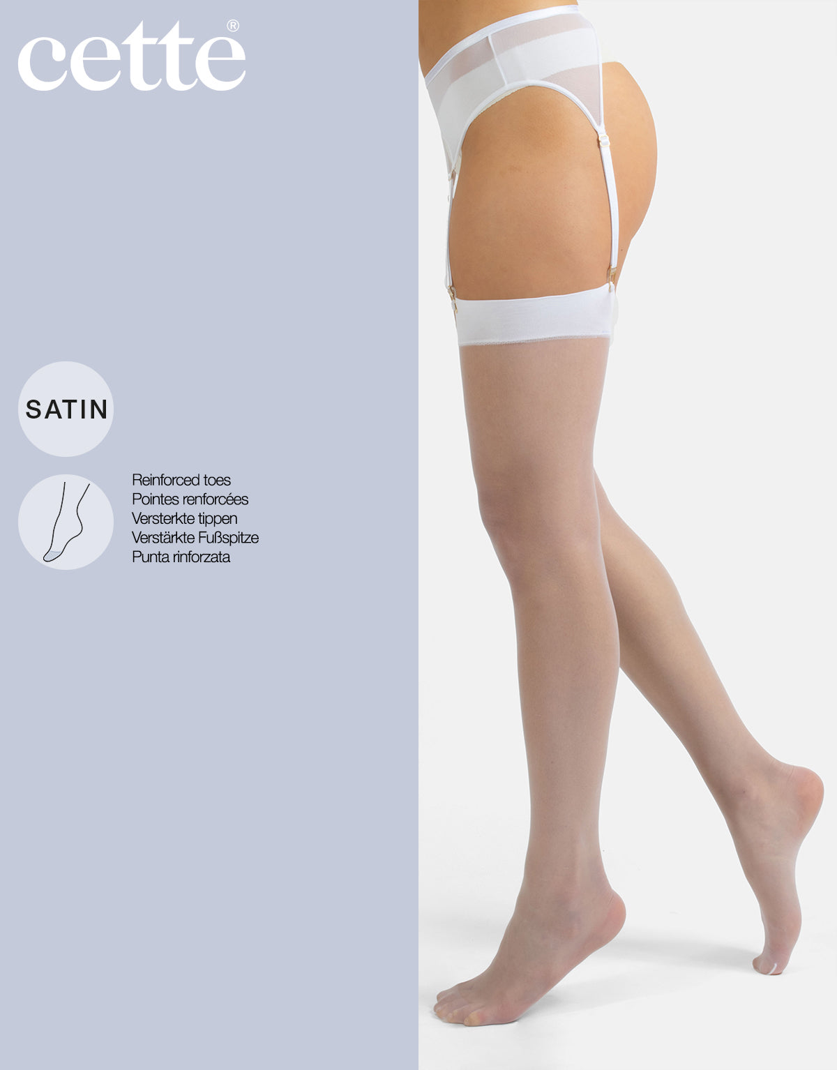 Semi transparent 20 den sheer suspender stockings made with soft and fine yarns. With an elastic and comfortable band to which the suspender belt is attached, these stockings are the perfectly simple and delightfully sheer. With invisible reinforced tips.