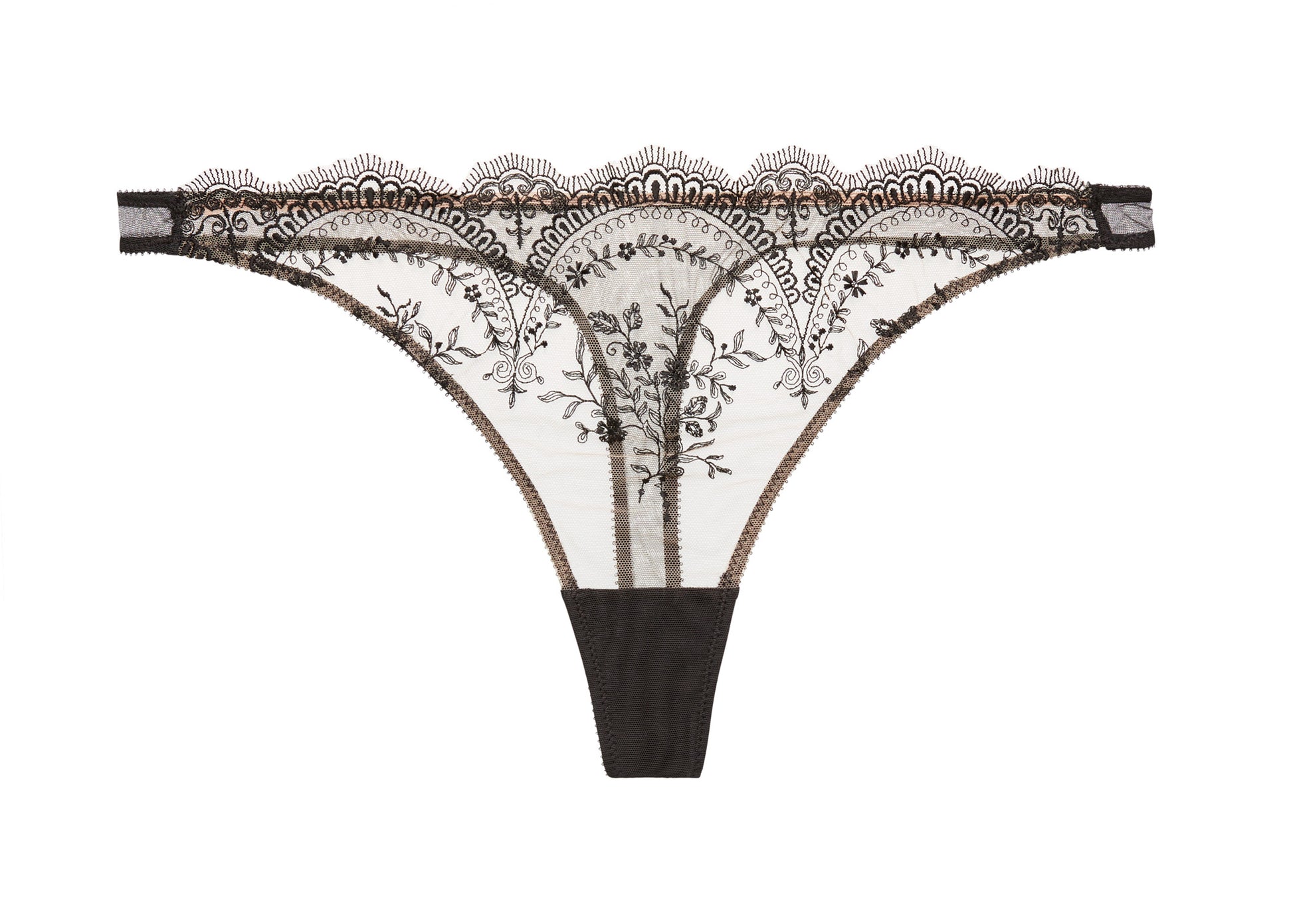 Stunning embroidered lace in classic black on sheer net! This sweet thong features an all mesh back for comfort and fit and is delightfully sheer!