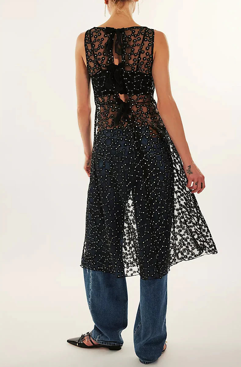 Sheer mesh, boat neckline, open back with bow closures, vintage embroidery all over.