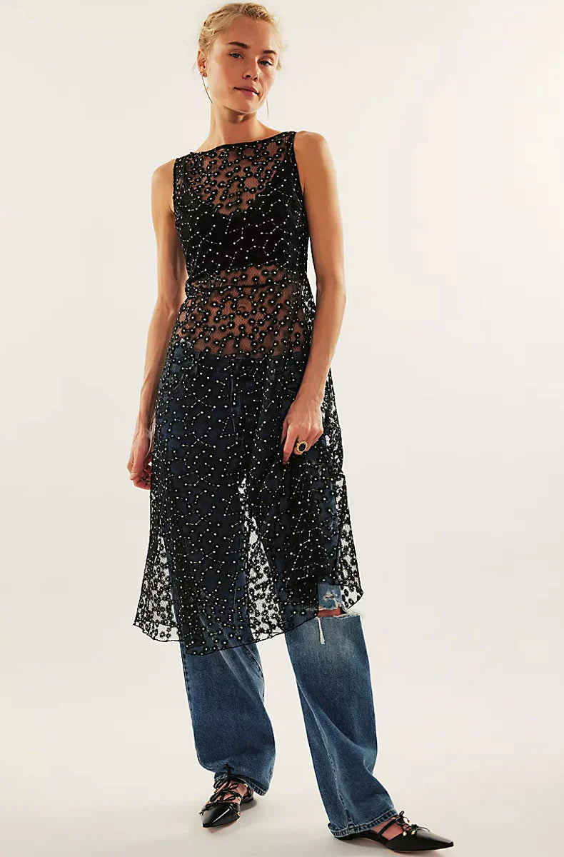 This stunning boat-neck dress from Only Hearts is featured in a midi length and stunning sheer fabrication with embroidery all over for the perfect detailed touch.