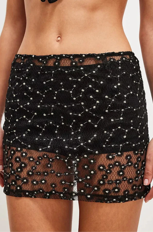 This sheer mini skirt from Only Hearts features a stunning embroidered print for super special added detail.