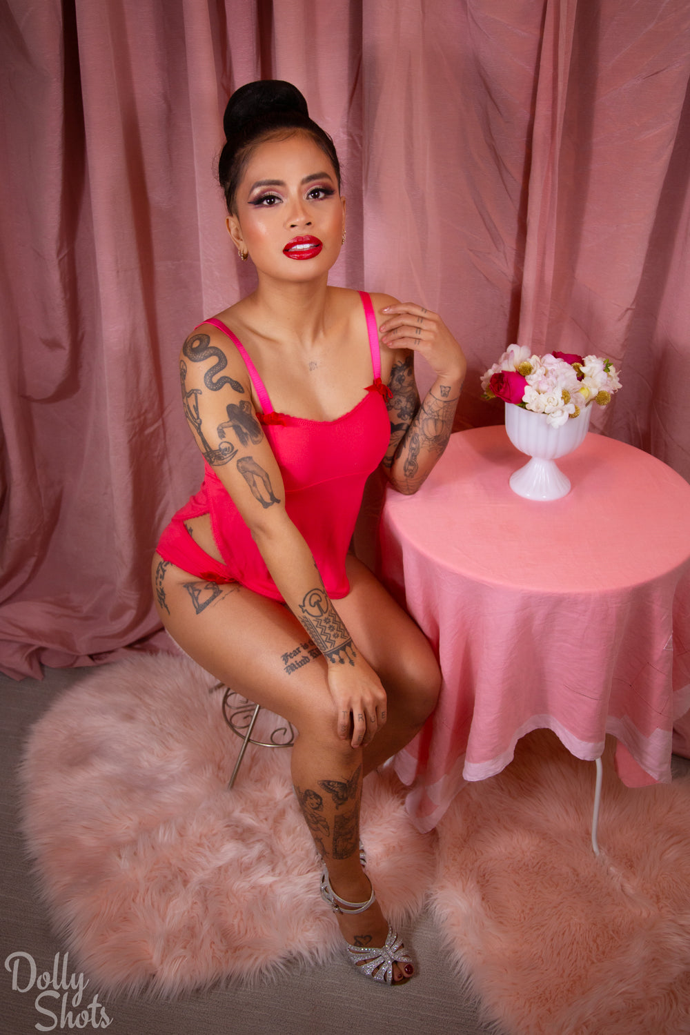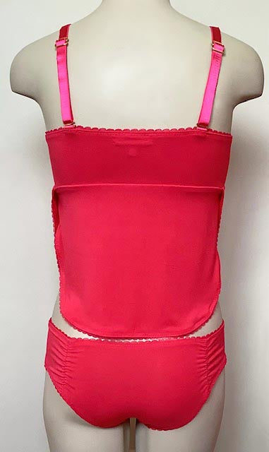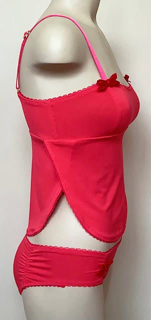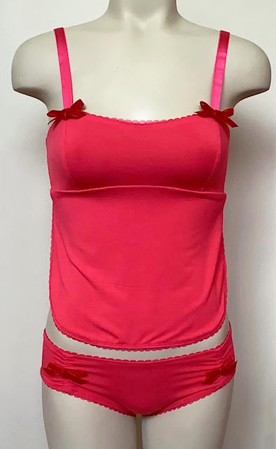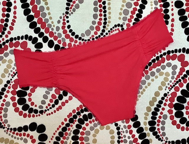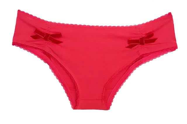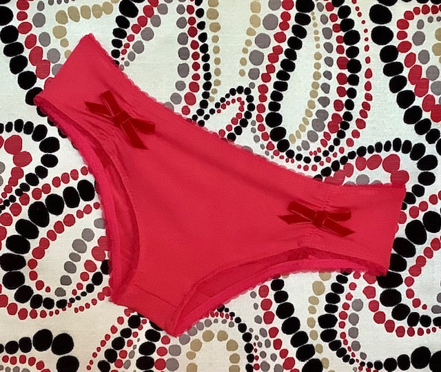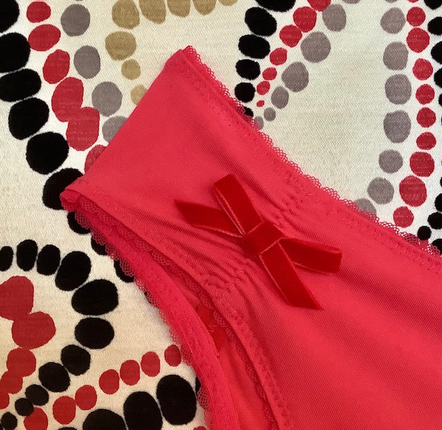 Super soft juicy deep coral pink bamboo trimmed in the softest micro-lace and finished with two cherry red velvet bows!