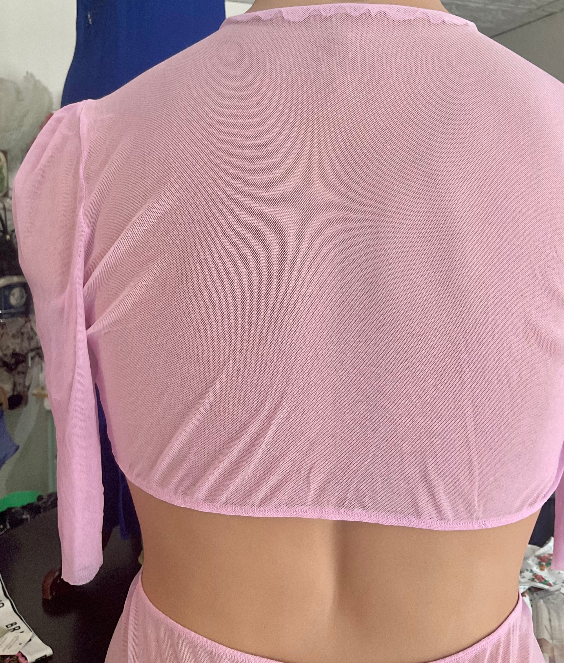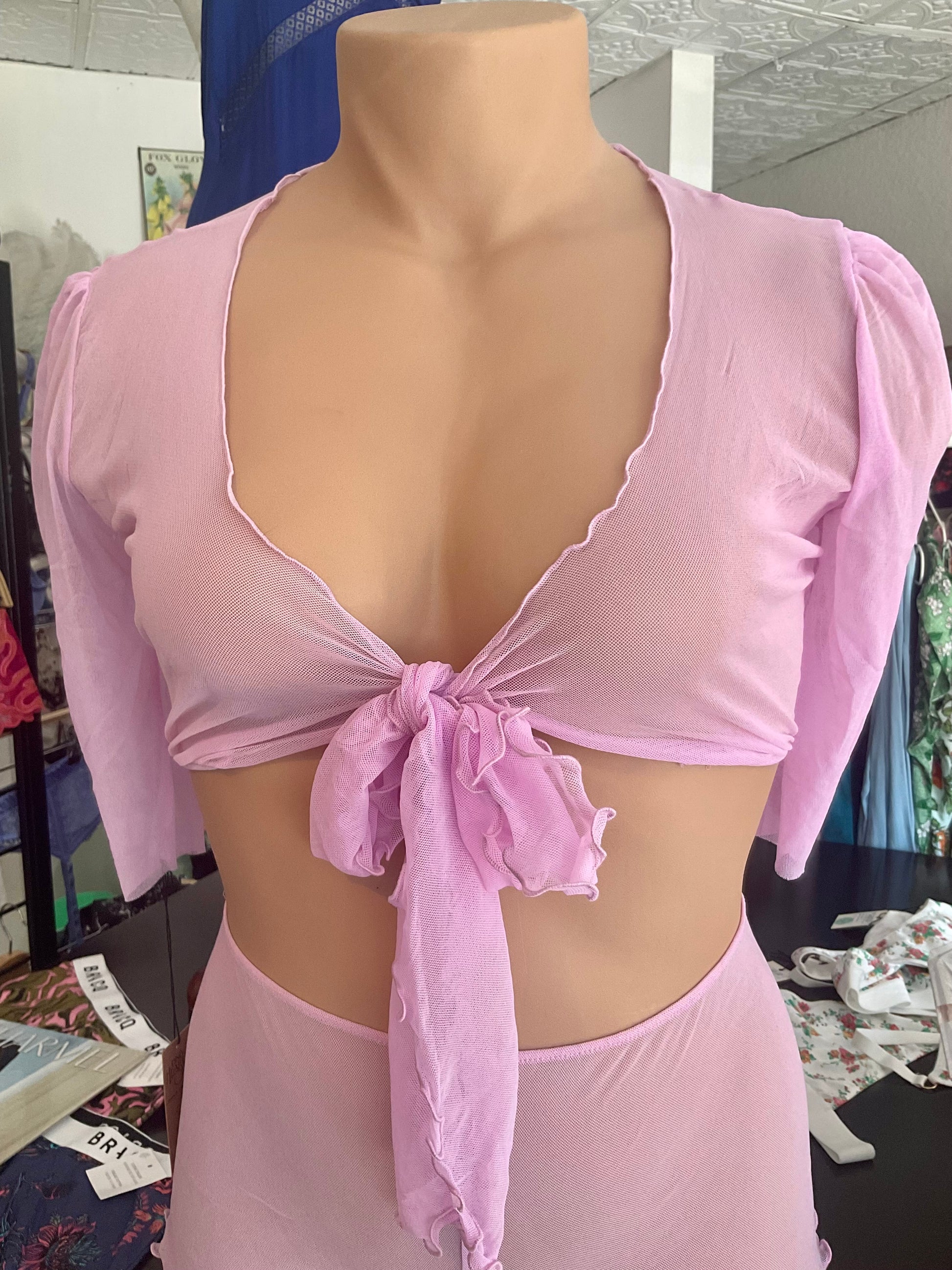 New style wrap top with lettuce hem, long wrap tie that can be tied various ways, sweet puff sleeve. Delightfully sheer and oh-so soft!