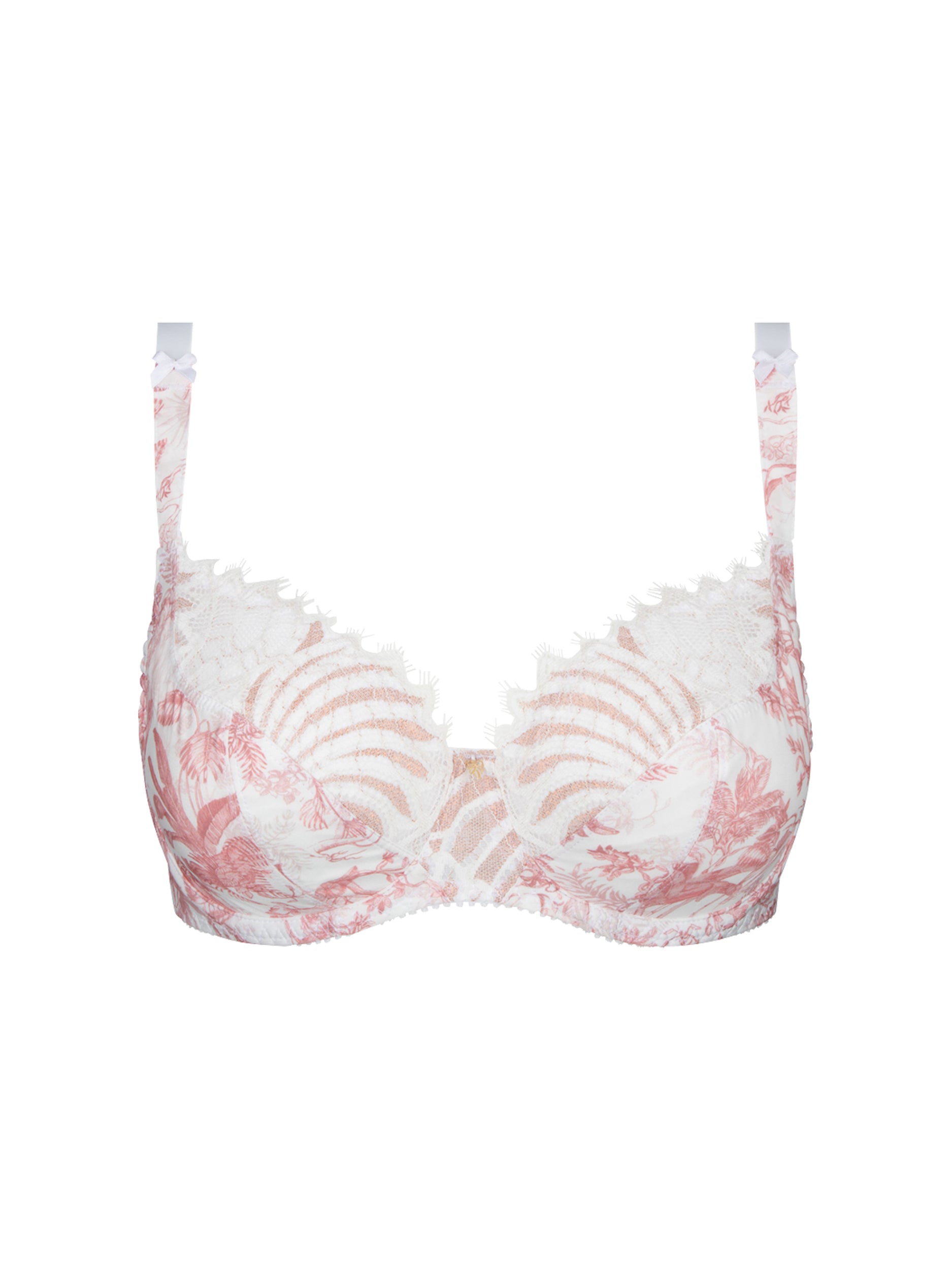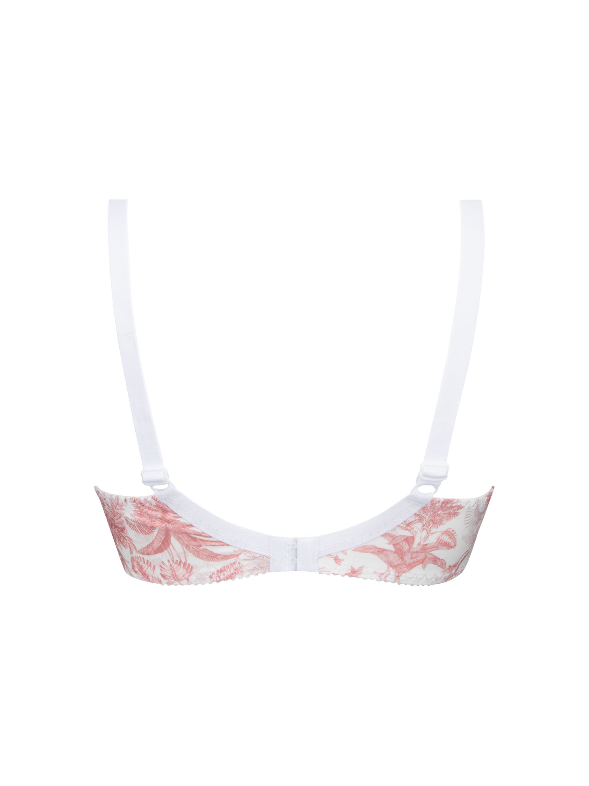 This demi underwired bra from the Jungle de Jouy collection offers a light and comfortable shape for a natural fit. The straps are made of mesh and follow the shape of the cup. A golden bra jewel dresses the bra. The cup shape is perfect for v-necks or lower necklines.