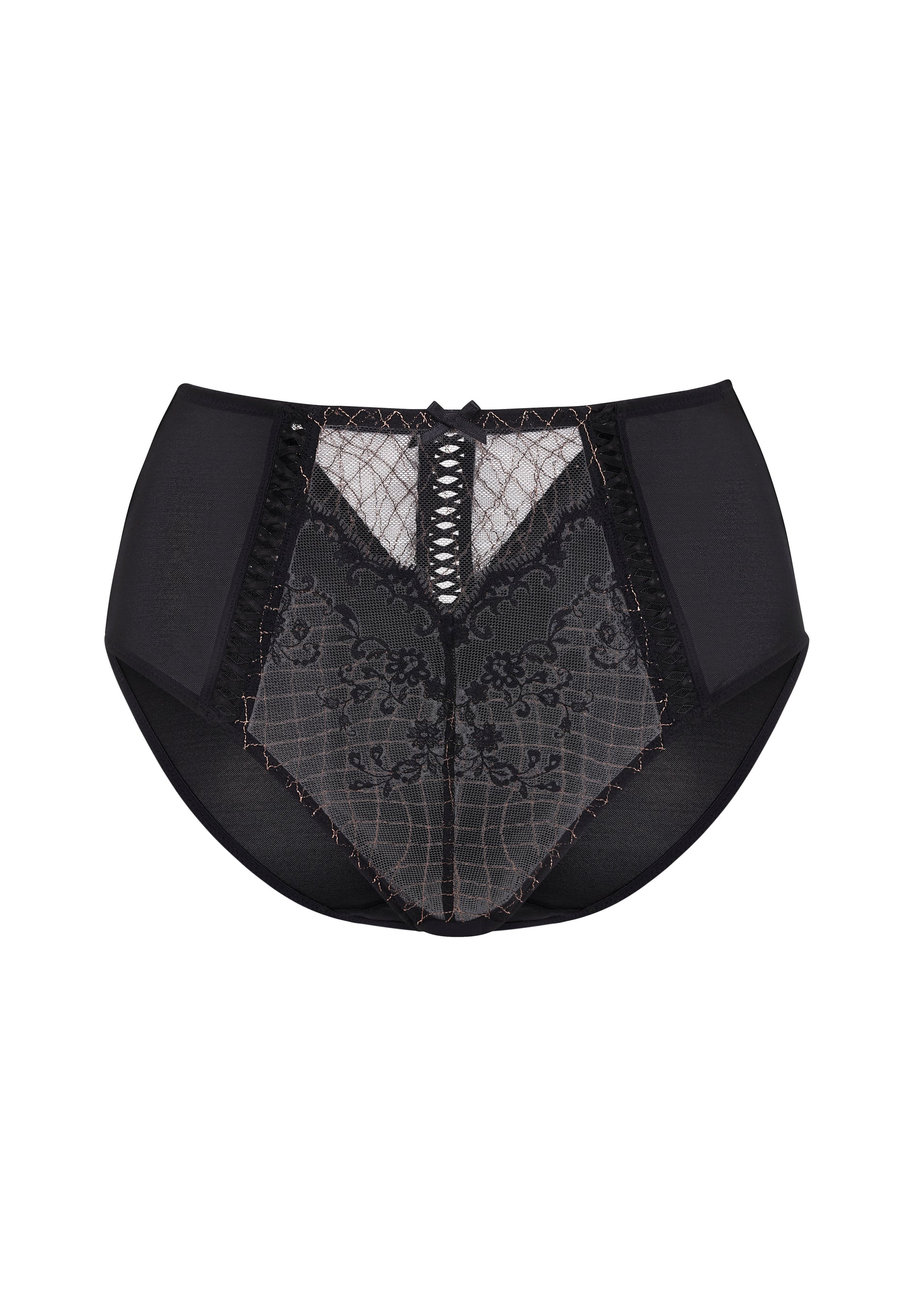 Bold and effortlessly chic, the Lacage High Waist Brief in Black combines intricate embroidery with metallic yarn for a touch of glamour. Featuring lace-up trims for a decorative finish, this brief offers extended coverage, sitting higher on the waist for added support and comfort. A perfect fusion of artistry and modern sophistication, designed to make a statement in any wardrobe.