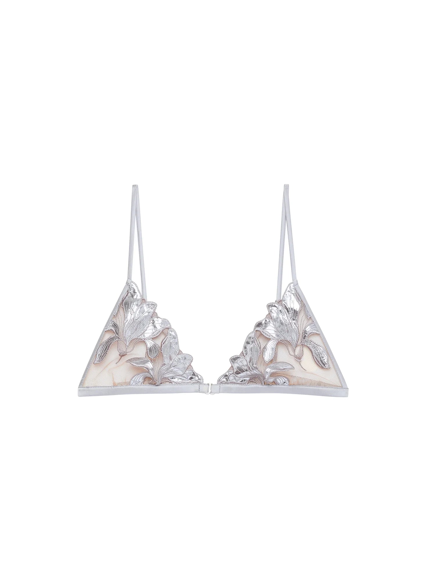 Lily Embroidery Triangle Bra, featuring sheer tulle cups trimmed with foiled lily embroidery.