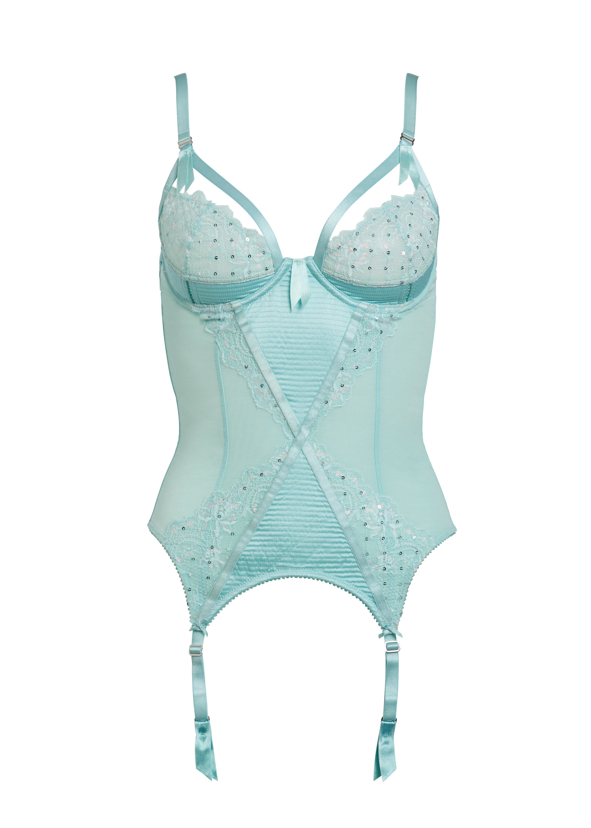 Why the quotes? Well, truth be told, this may be called a bustier but really it is very much a classic piece of lingerie called a "Merry Widow", the distinction is the longer length and attached garter straps!