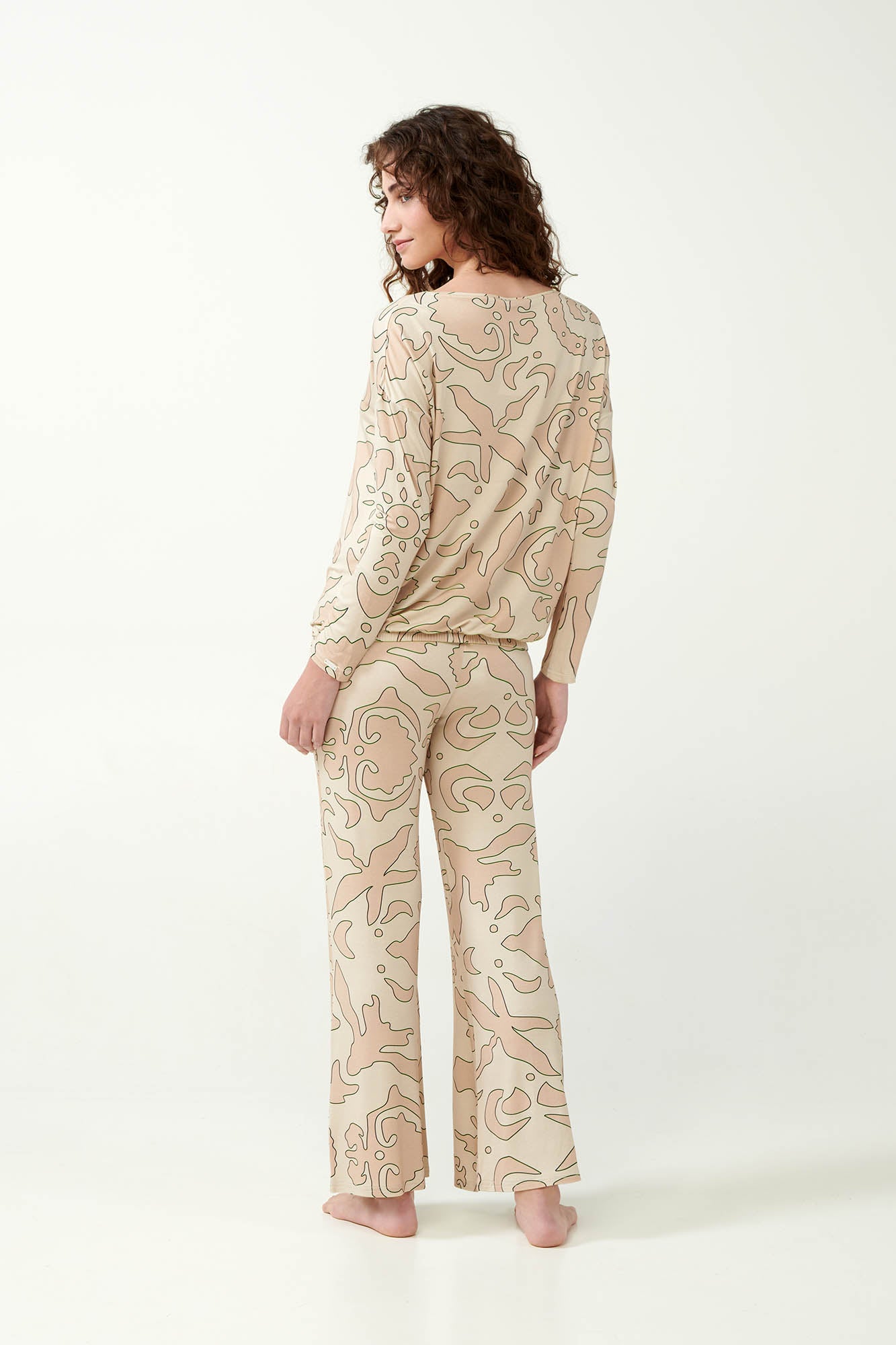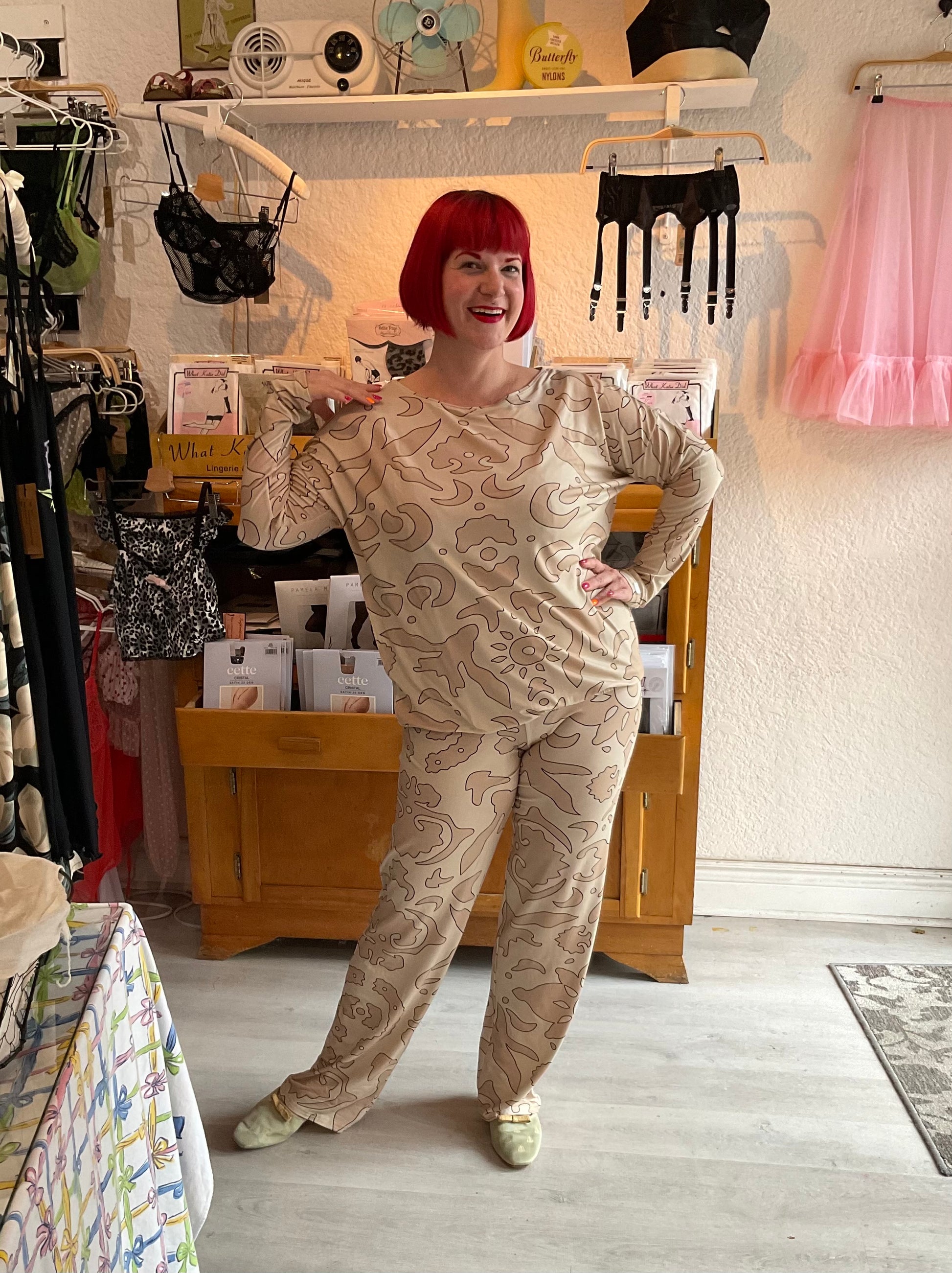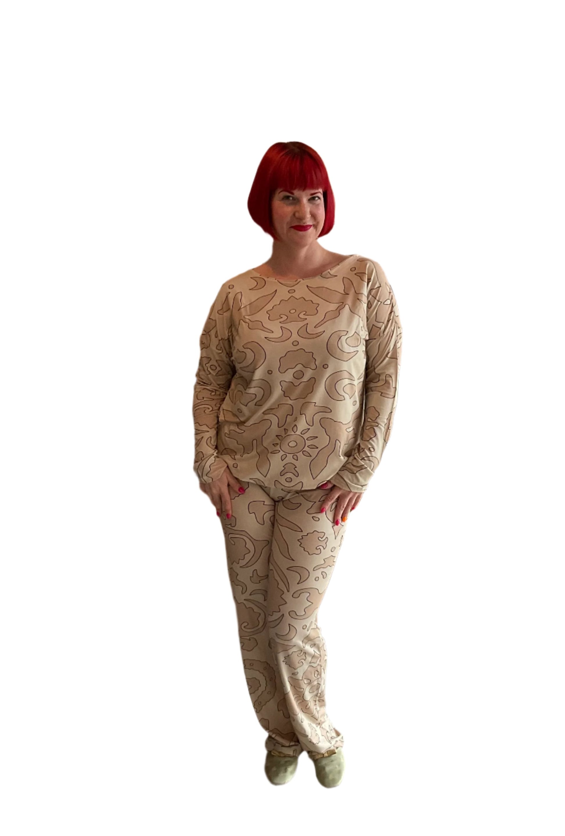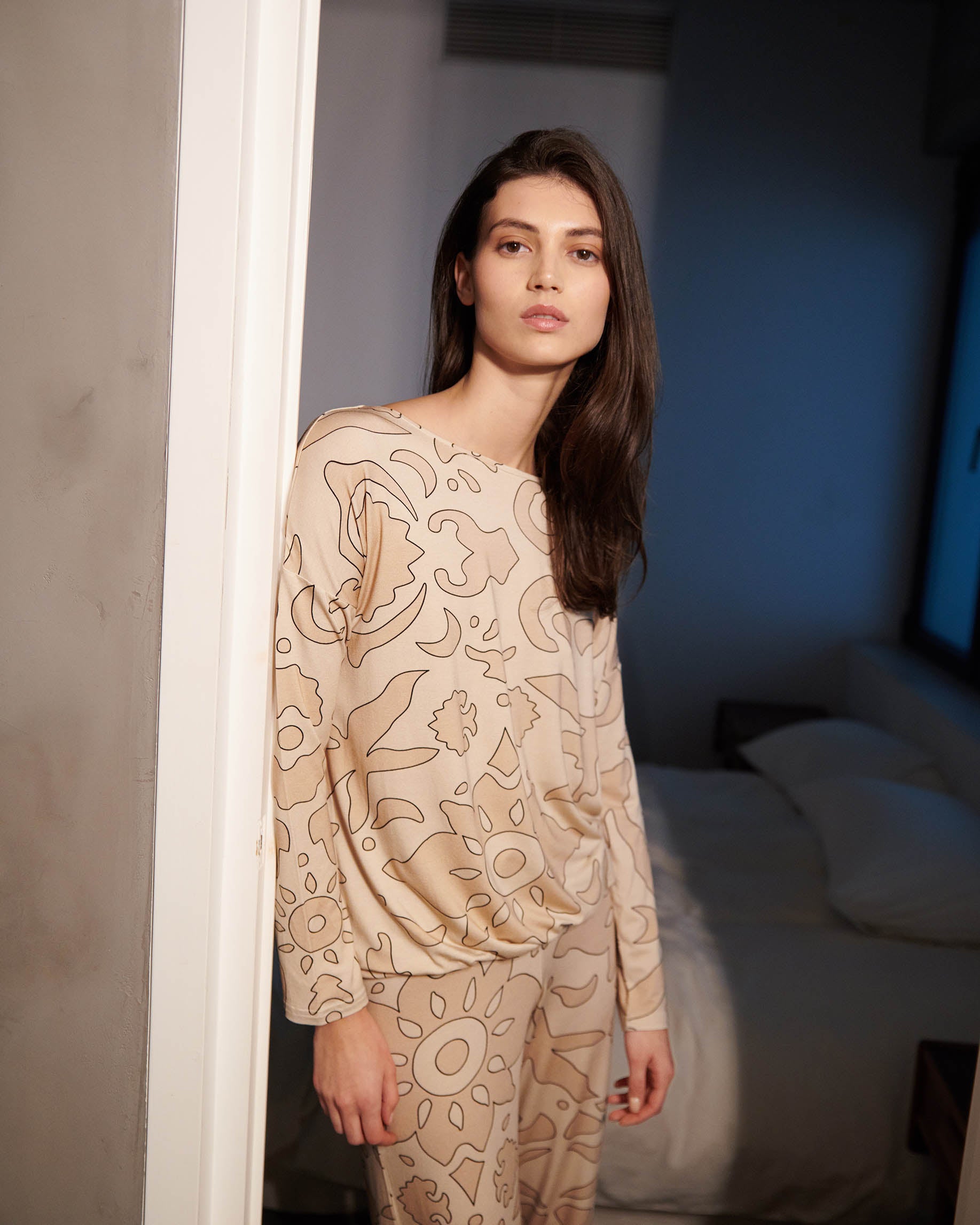 The Nadine PJ features a chic relaxed top and fitted stretchy pant with ribbon adjustable waist tie.