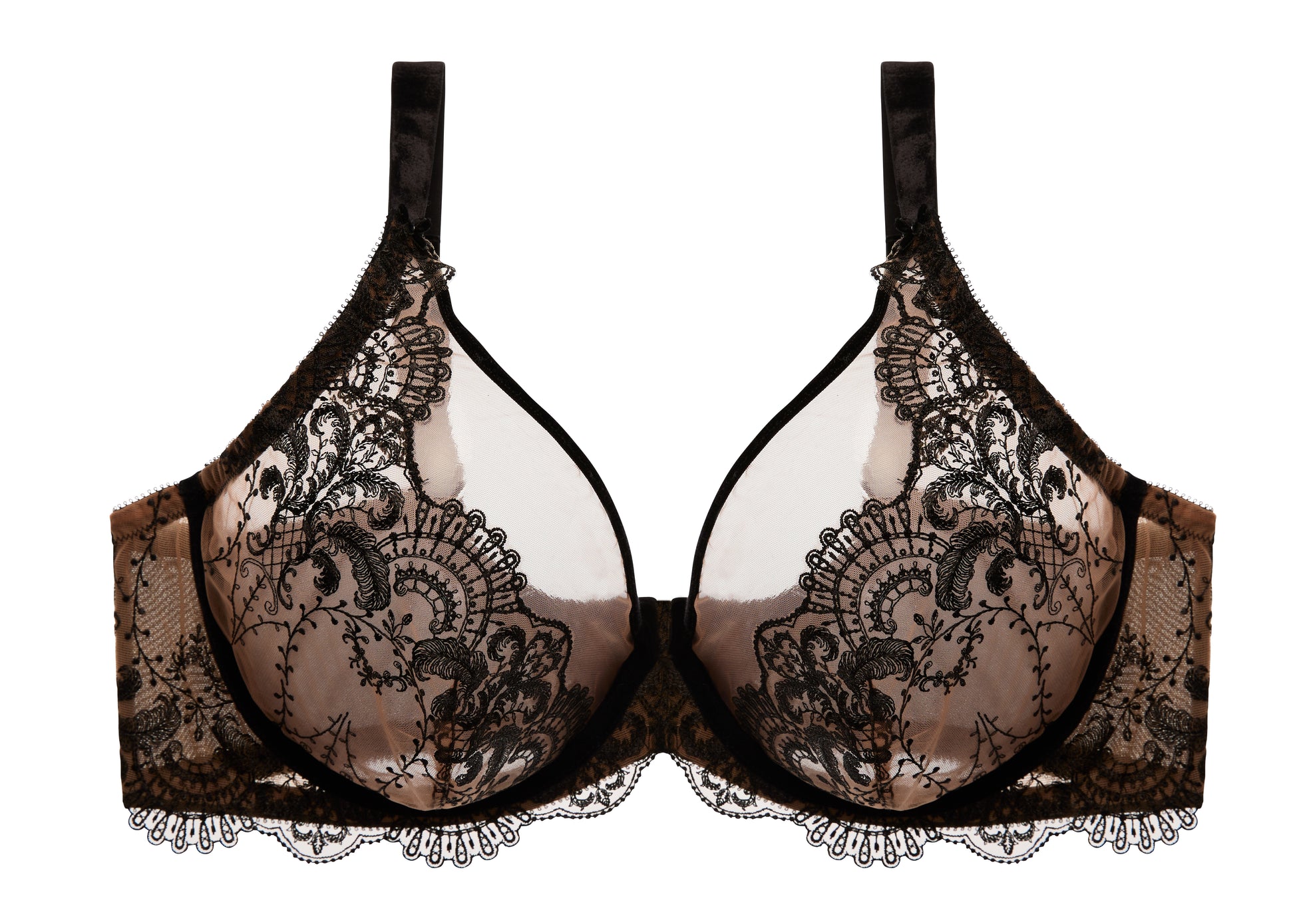 Dita designed the Nom De Plume Plunge Bra to be glamorous, easy to wear lingerie for her curvy customers. The bra is a plunge underwired sheer cup bra with lavish use of the delicate embroidery and detailed with velvet highlights. Velvet straps and velvet bow trims.