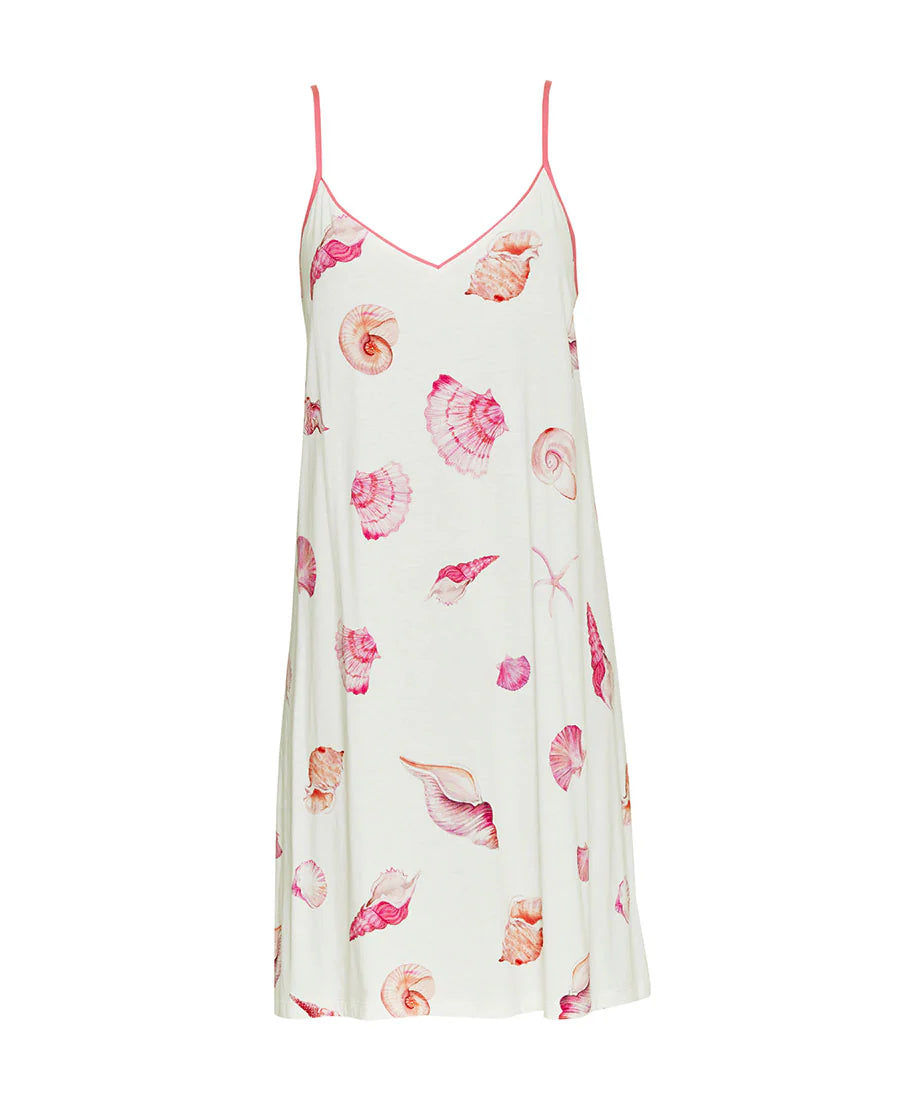 The comfortable straps and strappy chemise design evoke the tranquillity of beach mornings, while the charming pink shell print adds a touch of coastal sophistication.