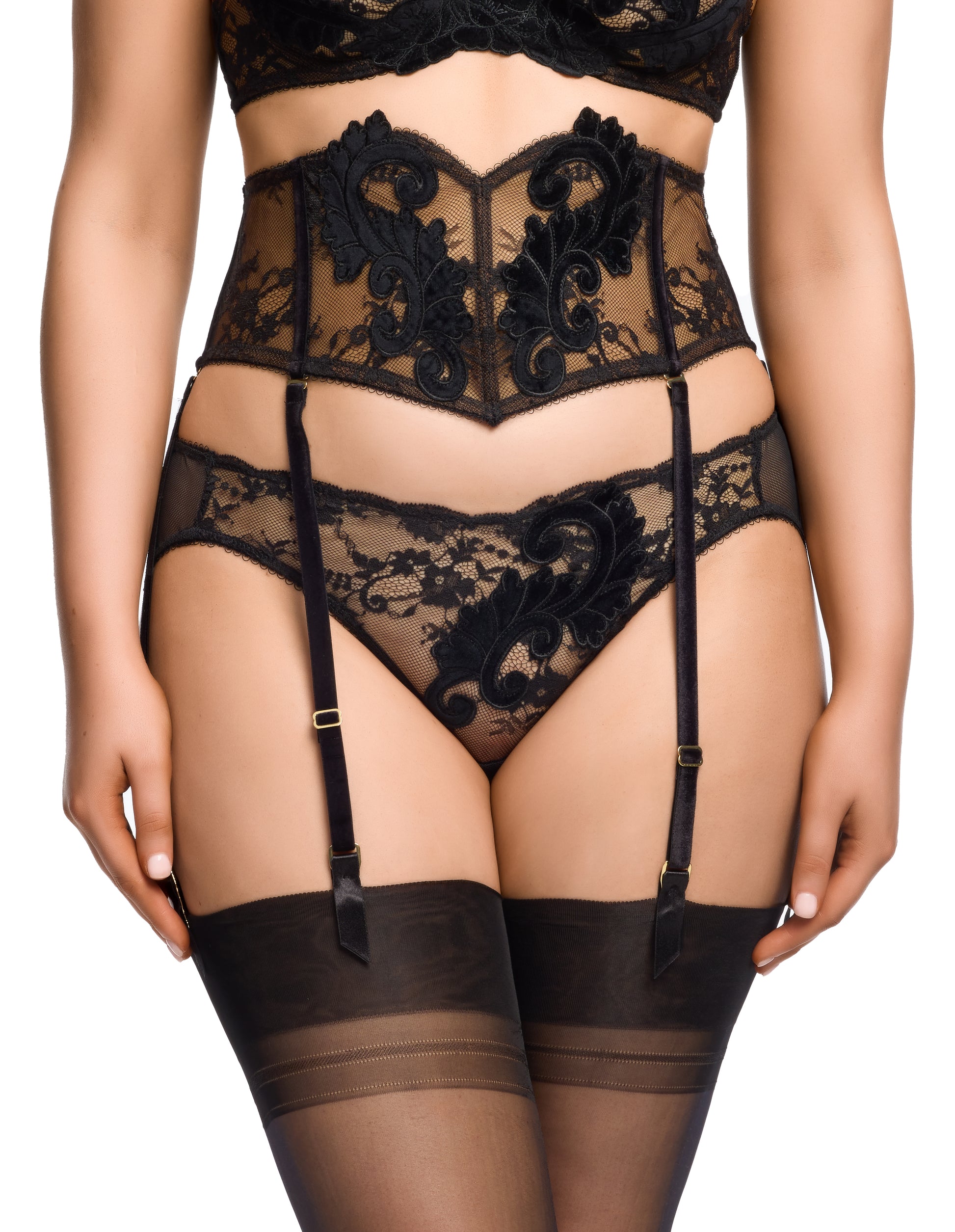 Perfectly named by Dita. Velveteese is evocative lace lingerie with rich velvet detailing. Dita designed a rich, swirling velvet applique on a fine lace ground. The Velveteese Suspender is a waist defining elegant suspender. The Suspender features the velvet appliques at the front with velvet covered boning to help sculpt and shape the waist. The Suspender features 6 detachable velvet garters and can also be worn as a waspie. Velveteese is a lingerie lovers delight!