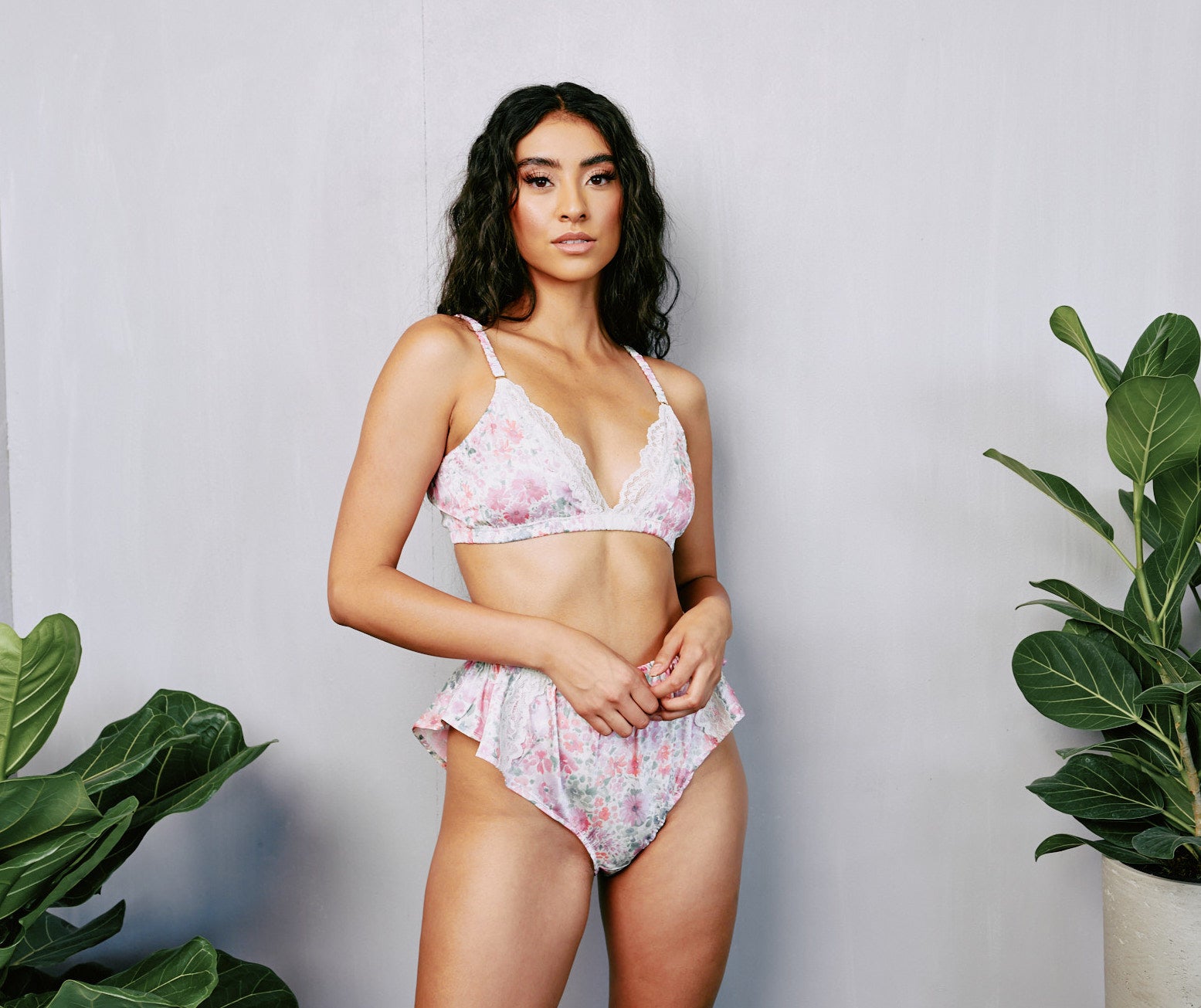Panty? Tap shorts? It’s a combo of both. This flutter panty inspired by vintage silhouettes feels so fresh. Comfortable enough to wear as panties or for lounging. High waist and high leg silhouette with a flirty flare at waist thanks to it’s bias cut. Gorgeous stretch floral lace details.