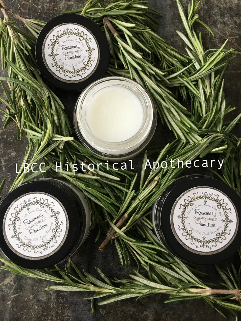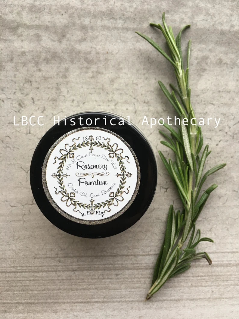 This pomatum is a soft pomade. It doesn't have any wax in it. This is an original 1860 recipe and is scented with Rosemary which was a popular herb to use in various toiletries. Historically it was used in a lot of healing ointments as well. With flowers and herbs having symbols and secret languages attributed to them, Rosemary was said to promote prudence, common sense, and self-assurance. It was also said to aid in easing headaches. I can see why rosemary was chosen when you think of the ideology of women at that time.