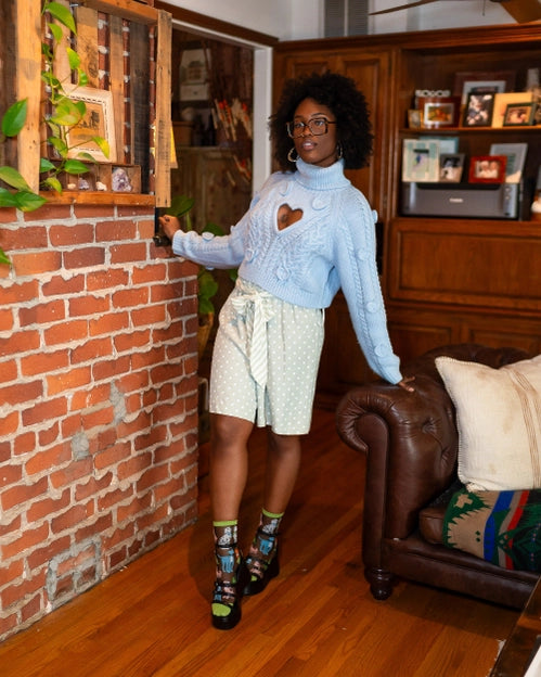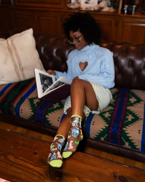 Bursting with personality, colorfully quirky pups in green, orange, pink, and white adorn the sock, making every step more fun. The fresh green cuff, heel, and toe add a playful Spring vibe, while the black sheer fabric keeps your look effortlessly chic.