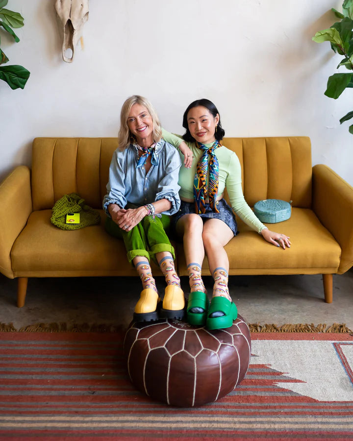 Add flair to your wardrobe with our colorfully bohemian evil eye print sheer sock. Each eye is uniquely drawn and different from the rest - you'll spot quirky lashes, cheerful teardrops, and jazzy eyeballs. Finished with a blue cuff, toe and heel, perfect for pairing with jeans and flats for a casual daily look!