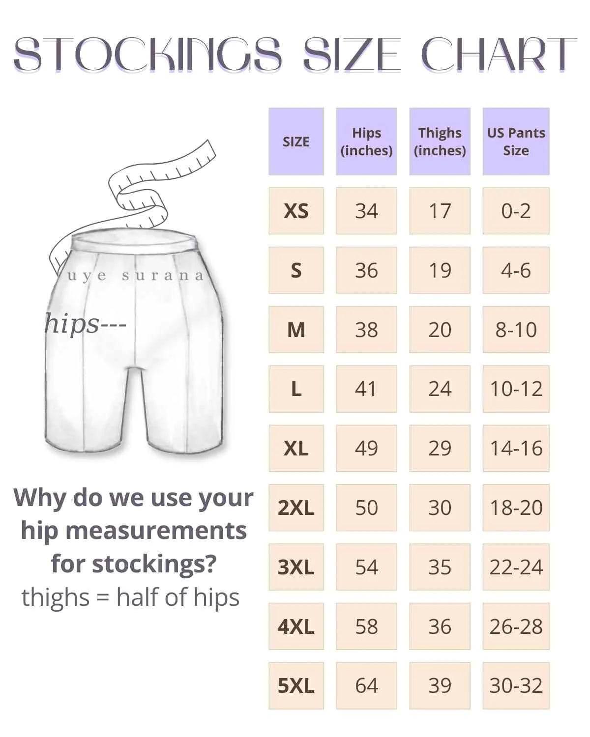 Uye Surana has updated the sizing for their stockings sizes to make choosing the right size even easier! XL/2X stockings are now L/XL and 3X/4X stockings are now 2X/3X.
