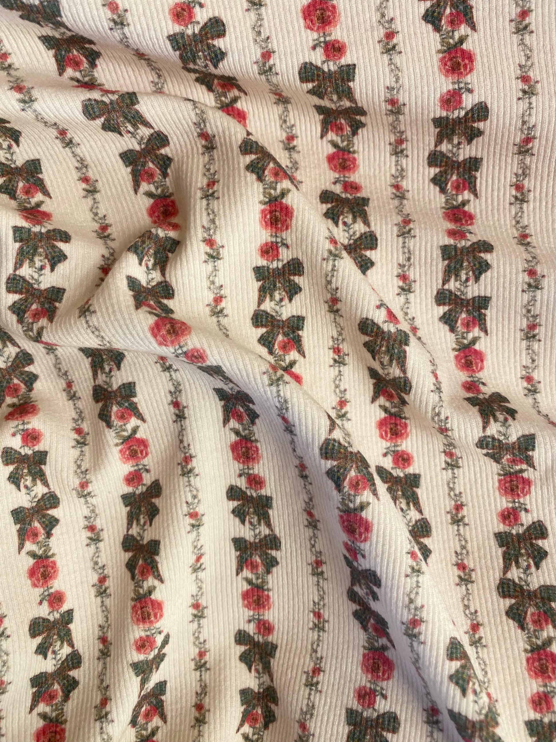 Super sweet holiday print of bows and wild rose garland, sweet lace trim and rosebud at waist!