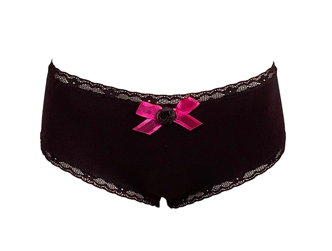 Christina is a must-have in super soft and stretchy inky black bamboo jersey with soft stretchy lace elastic trim, finished with a beautiful shocking pink organza bow and black rosette!
