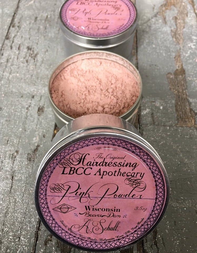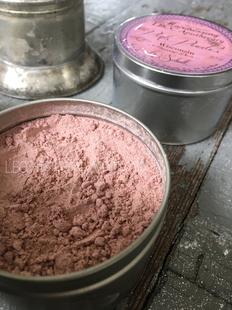 This recipe came from research in the Toilet De Flora and Adbeker as well as historical documents that talked about how Marie Antoinette preferred her hair powders be made from crushed flower petals. In addition to the crushed rose petals, this recipe also has Iron oxide which will stain your cheeks or hair a lovely pink. It has a lovely natural rose scent to it.