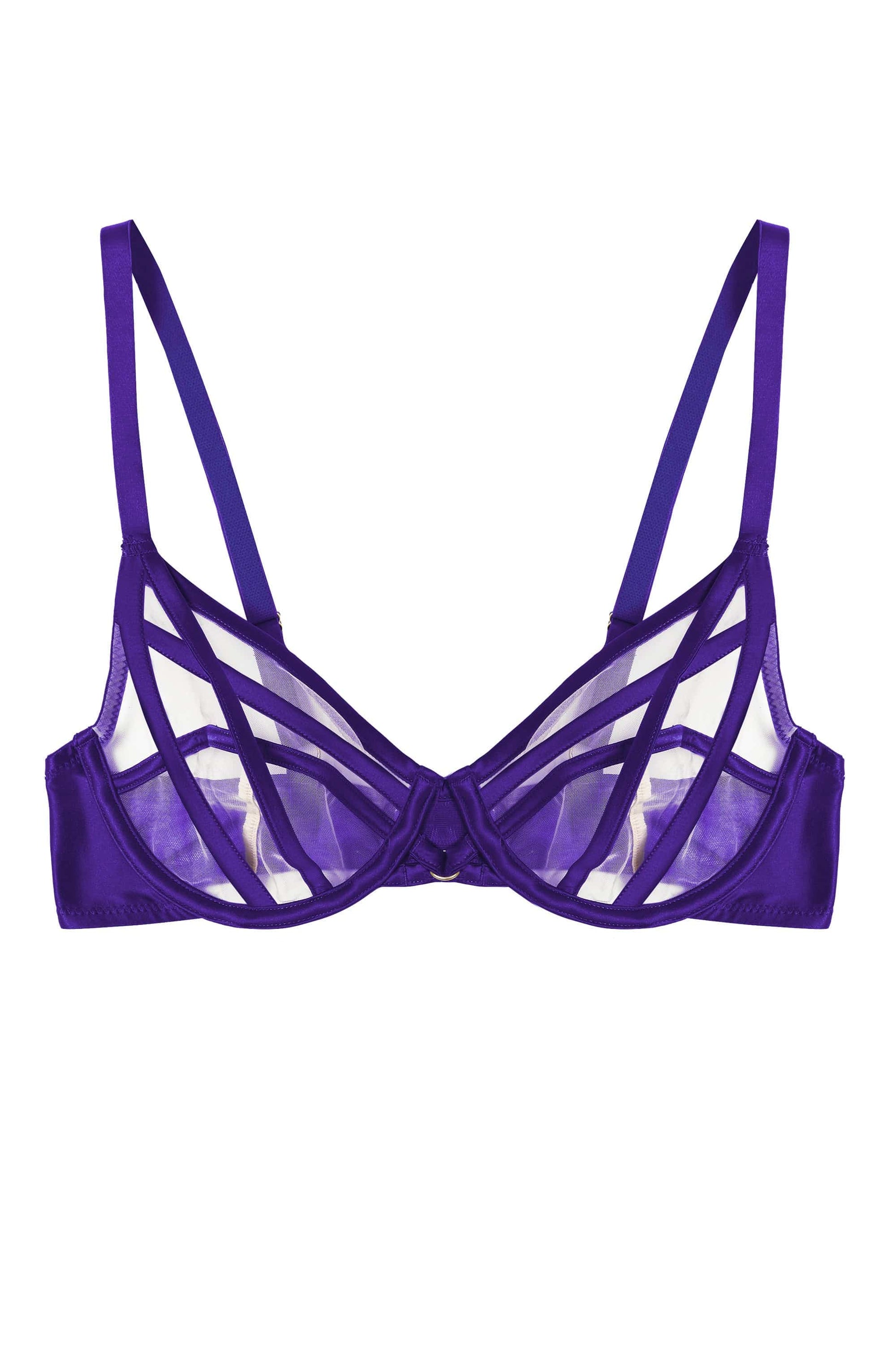The unforgettable Ramona Purple Strap Detail Illusion Mesh Bra. The mesh cups and luxurious Purple satin crossover detailing creates a barely-there illusion that is sure to enchant you This piece is designed to delight and support you at the same time.