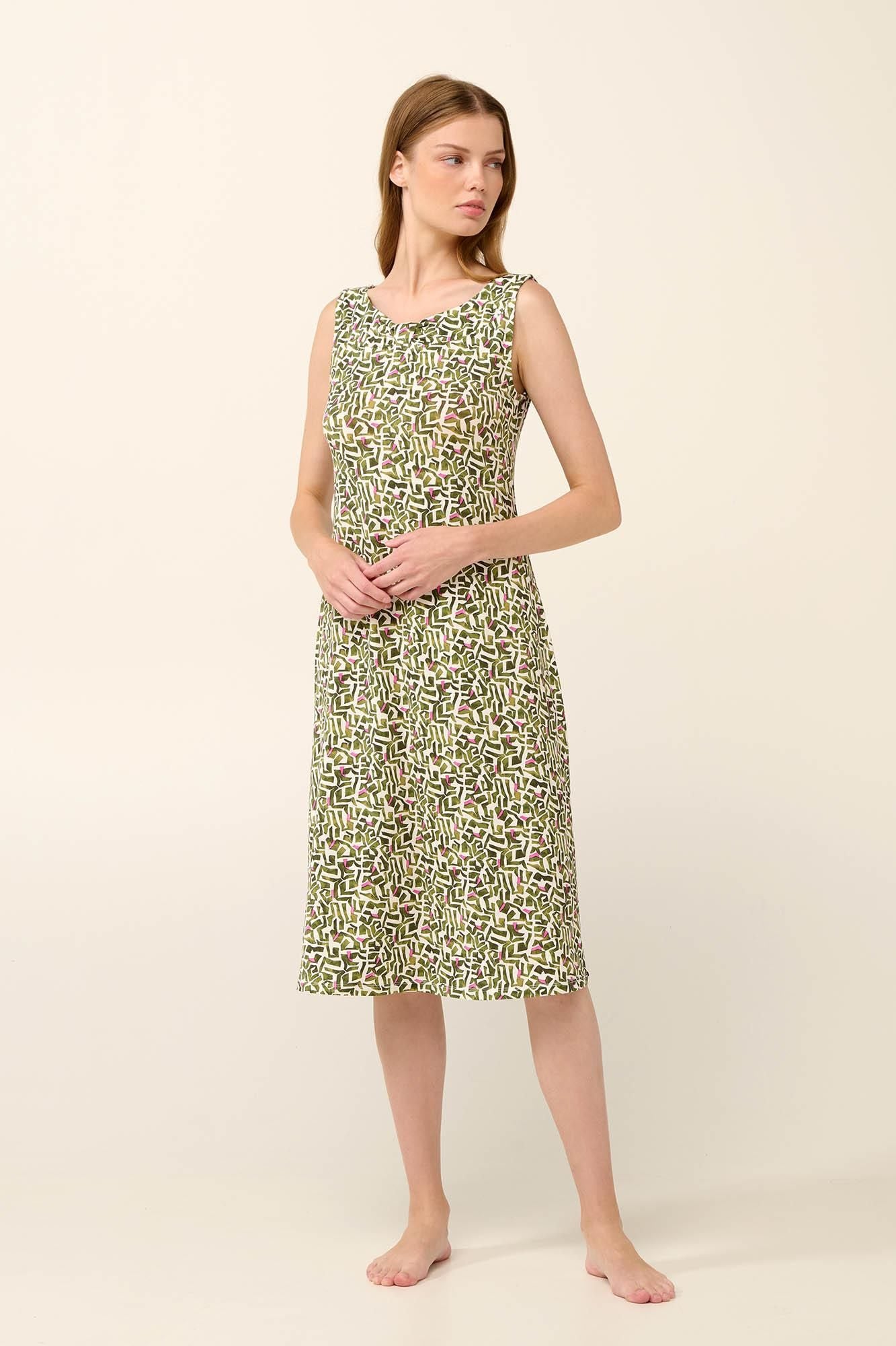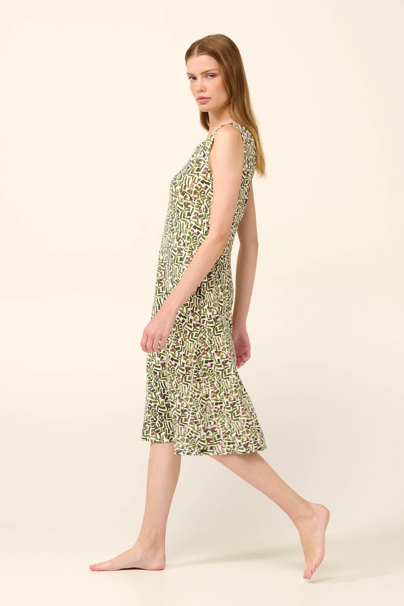 This retro style summer weight nightgown features a striking geometric print and a sleeveless design. With a regular fit, it offers comfort and ease on warm nights. Made from soft micromodal, it feels light and breathable. Ideal for lounging or sleeping, this nightgown combines stylish design and practicality for a chic addition to your summer sleepwear collection.