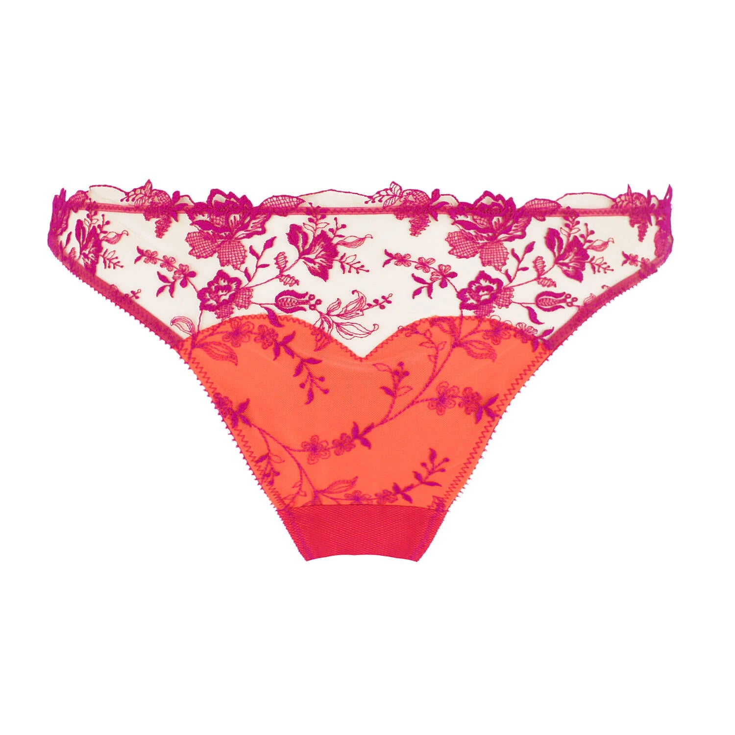 The Victresse Thong features delicate floral embroidery at the front over a heart shaped contrast satin inner layer and a soft stretch micro-net mesh thong back.