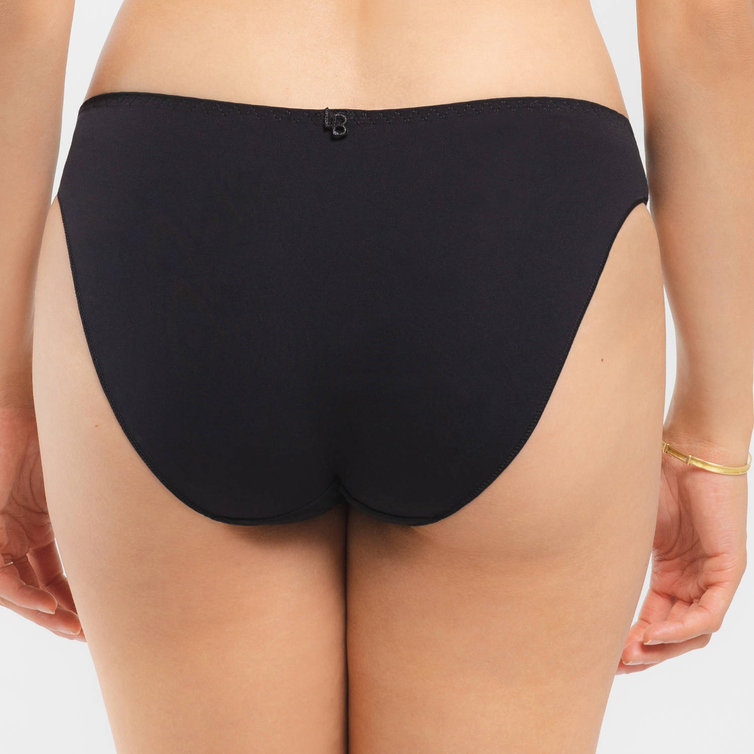 Jet black polymide with sheer black nylon and exclusive blue and pink zig zag embroidery! This full coverage low rise brief is gorgeous, comfy and sexy! Cotton gusset.